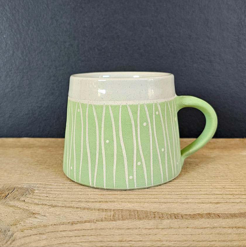 Die Formgebung der Tasse – Sgraffito Lindgrün gewährleistet eine hervorragende Standfestigkeit. Das vertikale Wellendesign mit weißen, dezenten Punkten auf lindgrünem Untergrund verleiht der Tasse einen einzigartigen, modernen Stil. Innen und am Trinkrand befindet sich eine transparente Glasur. Die farbige Außenseite ist matt, wodurch eine natürliche Optik entsteht.